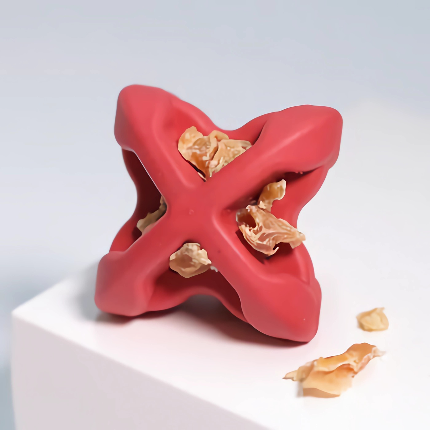 高品質で耐久性のある天然ゴムを使用しており、噛むことで歯やアゴを健やかに保つのはもちろん、おやつを挟んだり、ペースト状のおやつを塗るなどして遊んでいただけます。